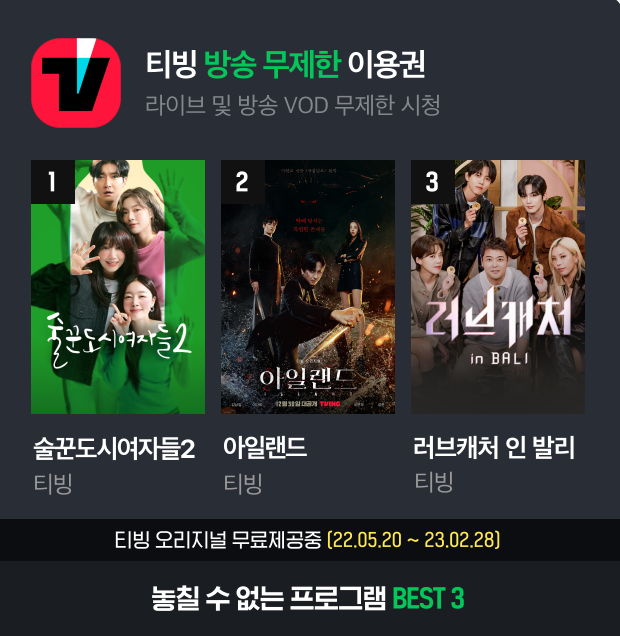 티빙 무료 이용 방법네이버와의 제휴로 2021년 3월 4일부터 네이버플러스 멤버십에 TVING 방송 무제한 시청권이 추가됩니다. 네이버 멤버십 가입자들은 매달 무료로 티빙 시청이 가능합니다.